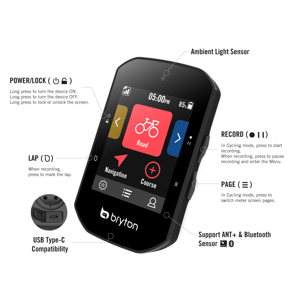 A través de la aplicación Bryton Active, podrás elegir rutas, invitar a amigos a unirse a un paseo en grupo y preestablecer mensajes en la aplicación para enviarlos al ciclocomputador. Puedes usar la función de reconocimiento de voz para ingresar mensajes mientras pedaleas.