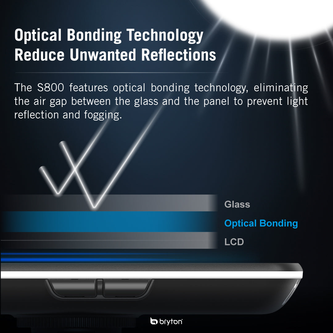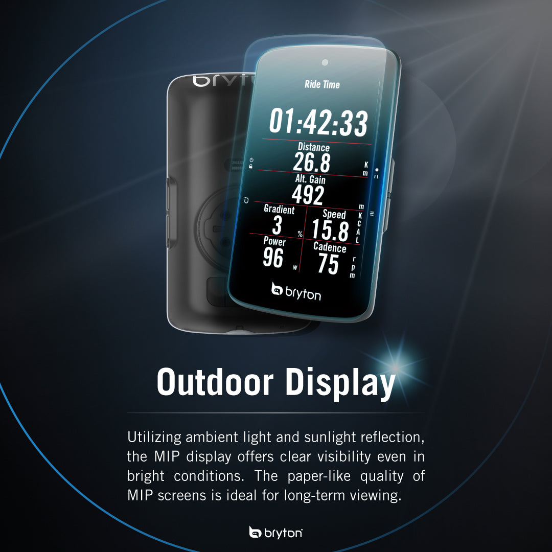 Designed with a 3.4-inch large screen, the Rider S800 utilizes MIP technology and a reflective layer to optimize outdoor display. The wide MIP display and narrow bezel offer a clear, high-contrast viewing experience, making this GPS cycle computer Bryton’s premiere device and enjoying uncompromised clarity.